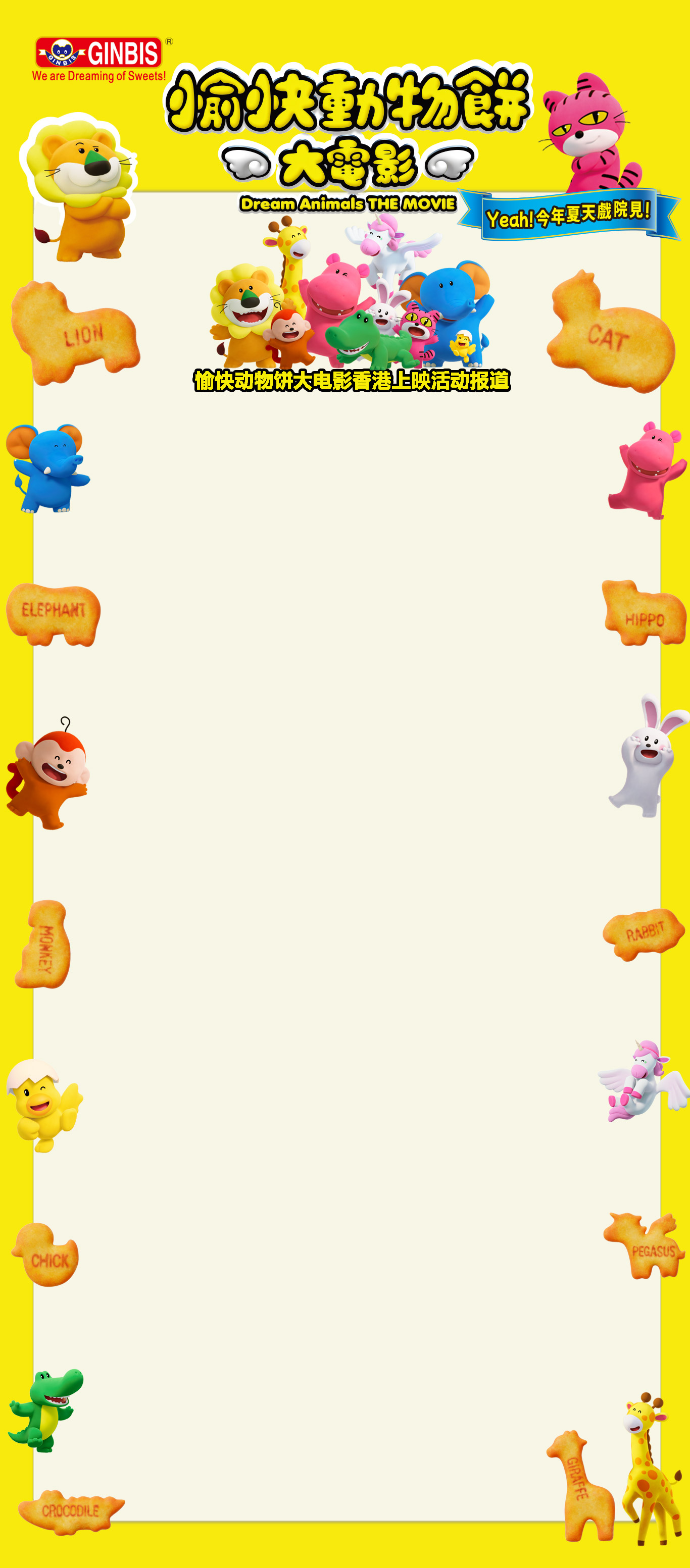 为纪念“愉快动物饼”在香港发售45周年,株式会社金必氏精心策划并精心制作的“愉快动物饼大电影 Dream Animals THE MOVIE”,于2025年7月11日在香港市中心的高端商场ELEMENTS举行了盛大首映式,来自日本株式会社金必氏宫本社长、四洲集团戴主席及其夫人,在香港日本国总领事馆总领事三浦大使、香港社会各界名流、多家媒体及众多的愉快动物饼粉丝参加了首映活动。日本国总领事馆总领事三浦大使和四洲集团戴主席上台致辞,愉快动物饼大电影主要制作人员和粤语配音的香港著名演员分享了幕后故事,盛况空前。株式会社金必氏宫本社长与日本国总领事三浦大使、四洲集团戴主席以及配音、幕后人员合影留念,并一同启动了电影上映仪式。